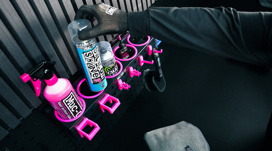 Introducing the Expert Muc-Off Bottle and Detailing Store Rack bundle. functional organiser is the ultimate way to stash your detailing gear and keep those MO favourites within arm’s reach. Designed to hold multiple bottles and aerosols up top, the rack also features clips and hooks, perfect for hanging cloths, brushes, extra bottles, and other cleaning essentials. Crafted from robust materials to handle the demands of any workshop, this rack is as practical as it is stylish. Easily mount it to your workshop or garage wall for a clean, pro-grade set-up that keeps everything tidy and ready for action. With the Muc-Off Rack, your gear stays sorted so you can focus on what matters most: keeping it pinned!